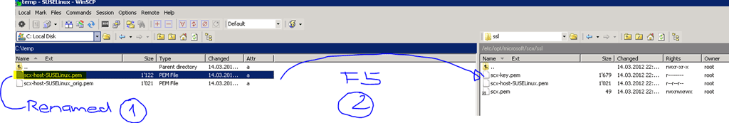 Next step rename the scx-host-SUSELinux-new.pem to scx-host-SUSELinux.pem and copy it back to the LINUX machine. by pressing F5.