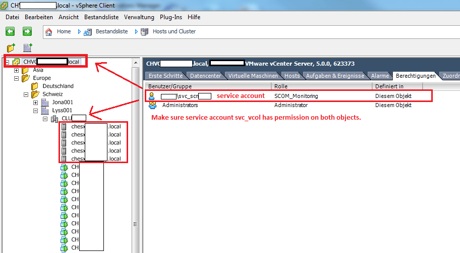In this case make sure your service account has the appropriate permission on the vCenter server. As mentioned above the account needs permission on the entire VI hierarchy.