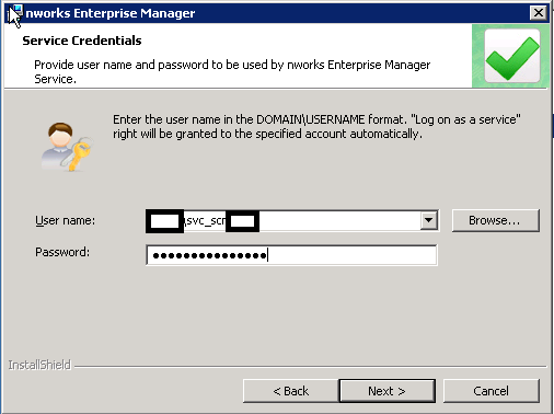 After the setup a dialog appears which will add the provided service account into a local group called “nworks Enterprise Manager accounts” on the server. Therefore you need to log off and logon again…