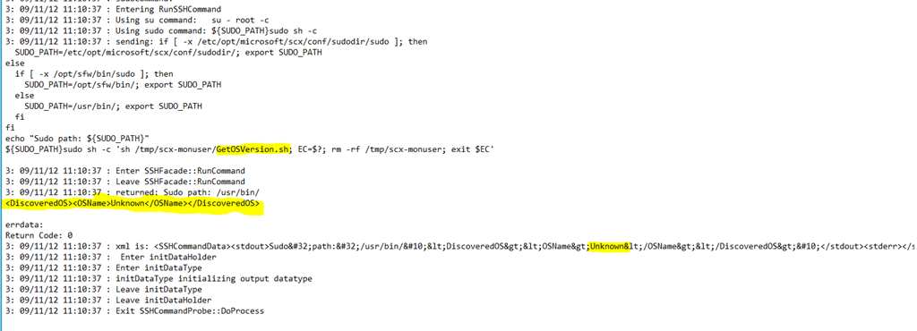 4) I checked each of the debug files for some errors or inconsistencies and I found in “SSHCommandProbe.log” an interesting output. As you can see a shell script called “GetOSVersion.sh” is executed on the Linux machine to identify the proper Linux version. In my case the output was “Unknown” and therefore the discovery wizard can not determine what release it would be.