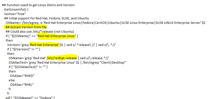 As you can see it will check the “/etc/redhat-release” file for “Red Hat Enterprise Linux” string to determine the operating system name and version.