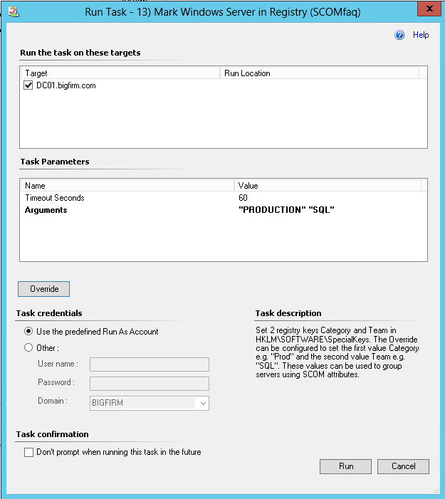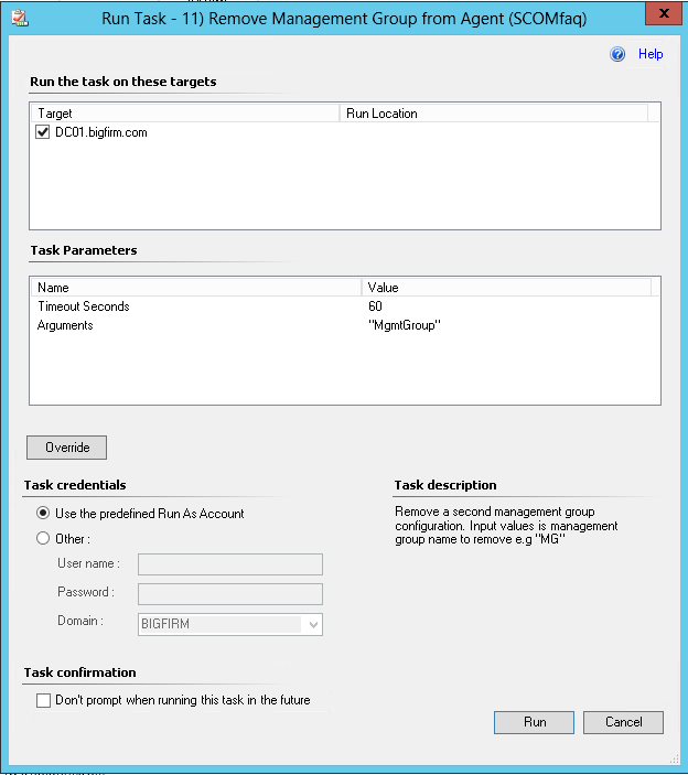 If you need to add another management group setting to an agent you can execute this task. Just select a managed Windows computer in SCOM, run this task and click the Override button. You need to provide 3 parameters: