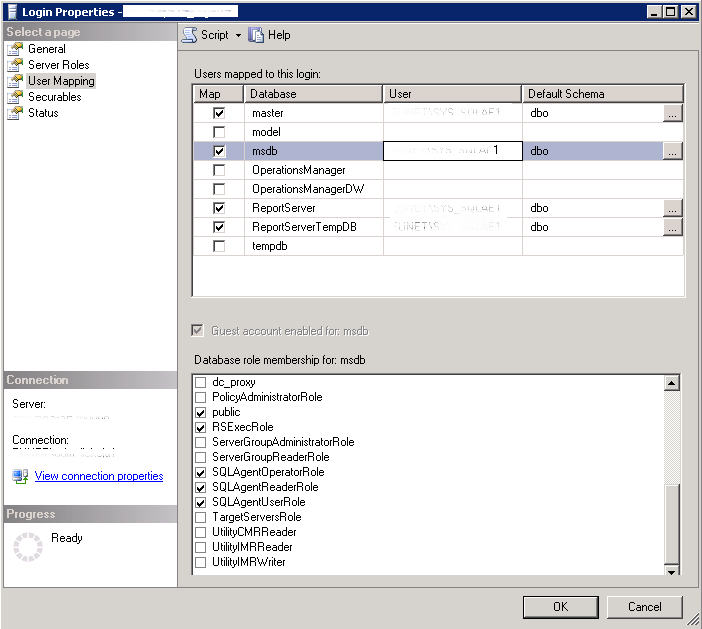 3. Open the properties of the just created SQL Server login account (which you created in step 2) in SQL Server management studio and configure the proper permissions like here…