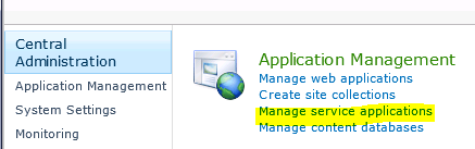 In my case I needed to add a Visio Graphics Service Application in SharePoint. We need this in order to run the upcoming PowerShell InstallOpsMgrDataModule.ps1 script which will register the necessary data module with this Visio Graphics Service Application. Go to the Central Administration website and under Application Management select Manage service applications…