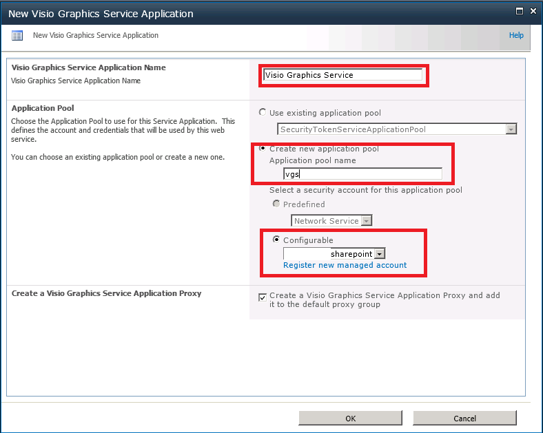 Give this Service Application exactly this name Visio Graphics Service. I created a new application pool called vgs (=vgs stands for visual graphic service but you can name it whatever you want) and used the SharePoint service account…