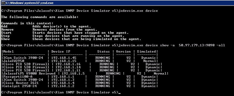 SNMP Device Simulator offers you also a batch command jxdevsim.exe which you can use in scripts and let’s you add / remove / start / stop devices…