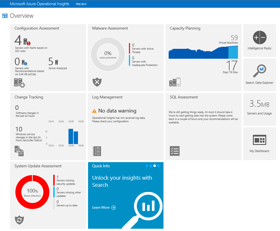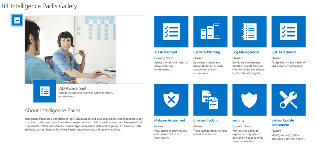 In October at TechEd Europe 2014, Microsoft announced Microsoft Azure Operational Insights. The “old” System Center Advisor functionality is still available and has been integrated as part of Microsoft Azure Operational Insights. The new Microsoft Azure Operational Insights service provides much more than the original Advisor service which provides just configuration assessment. Operational Insights provides a highly scalable, elastic platform which can provide deep insight into your different areas of your environment. Microsoft Azure Operational Insights uses additional modules which you are able to add to the service and therefore extend the functionality. These “extensions” are called Intelligence Packs and deliver new capabilities to gain deep insights into your environment. Today there are the following 7 Intelligence Pack available and during the next few month Microsoft will extend and build new Intelligence Packs for Microsoft Azure Operational Insights.