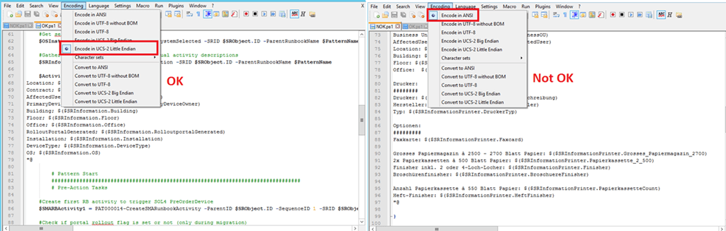 Just from a first brief look we can tell that both files are not the same “format”. The “format” or better character encoding of the file seems to be different. Therefore let’s check both encoding types in Notepad++…