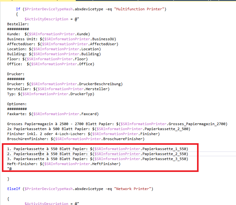 The description text contains some summary data from the service request written in German language and some French character. The description text is wrapped in a here-string and the problematic character is an “à”. I was wondering how the script looked in SMA and therefore I checked the editor in SMA. The runbook itself in SMA looked like this, notice the “rectangle” characters…