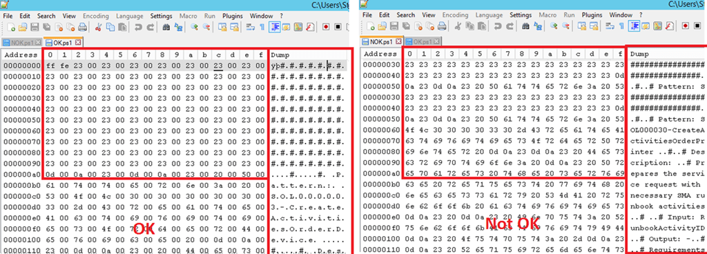 I resarted Notepad++ then I opened both files and switched to HEX view. On the left side the “OK” runbook and on the right side the “Not OK” runbook which caused some problems. We clearly see there is a difference in the code…