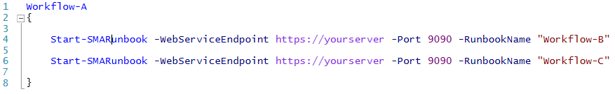 There are two different methods to call a nested / child workflow. Either you call Workflow B and Workflow C directly from Workflow A or you start these runbooks with Start-SMARunbook Cmdlet. So what is the difference? If you call the runbook directly from Workflow A, like in this picture, ONE SMA job and one sandbox is created.
