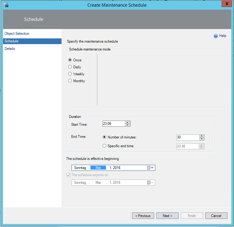 The problem since I can remember is, that there is no way to schedule maintenance mode in the future. We always had to create some sort of scheduled task and PowerShell scripts, which was not very elegant. In SCOM 2016 TP2 Microsoft introduced Maintenance Mode Scheduler in Administration/Device Management/Maintenance Schedules. You are able to put single objects or objects and all it’s containing objects into maintenance mode using an advanced schedule…