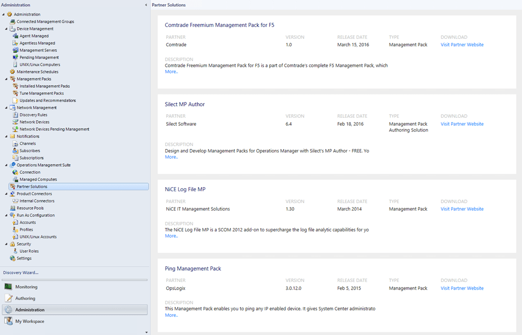 Another new thingy is the Partner Solutions feature, this allows registered and certified System Center Operations Manager partners to “promote” their solutions, so you can get it directly from their home page. It is a nice little catalog for extending your SCOM.