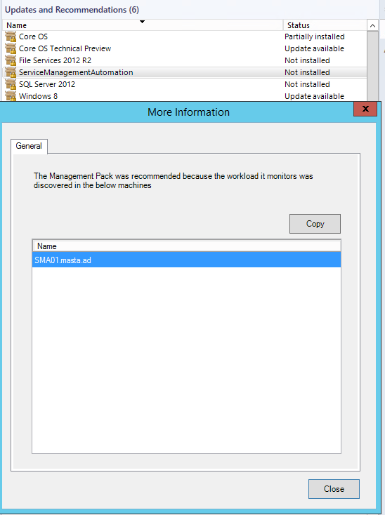 The next new feature is Updates and Recommendations, which you also will find in Administration/Management Packs/Updates and Recommendations. I have deployed agents to a domain controller, SMA and SQL Server. In addition, I have only imported the core OS management packs. The result is, that SCOM recommends installing MP’s for the technologies, I have mentioned and in addition I get recommendations for updating management packs.