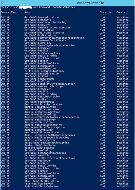 So but what is now the point of this post? Well, so far we have seen, that we can get information about SQL Server and MySQL databases using these PowerShell cmdlets using the Admin API, for VM’s use VMM as a data source, but what about websites? There are also modules installed on the web controller servers itself, e.g. the WebSites module…