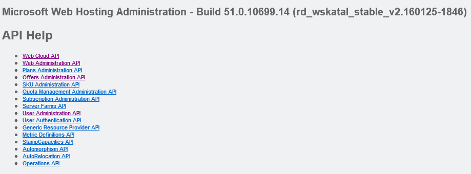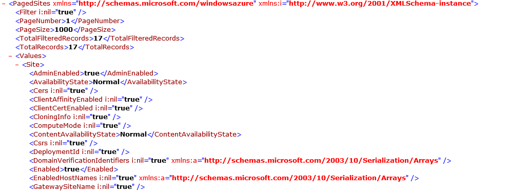 …well there is a whole lot of configuration to explore. What we want, is a listing of the deployed websites. After some time I figured it out what the URI is, you need to use this https://ADMIN ENDPOINT URL/20130801/webadmin/systems/DEFAULT WEB SPACE NAME/sites, and you will be provided with a listing of provisioned websites…