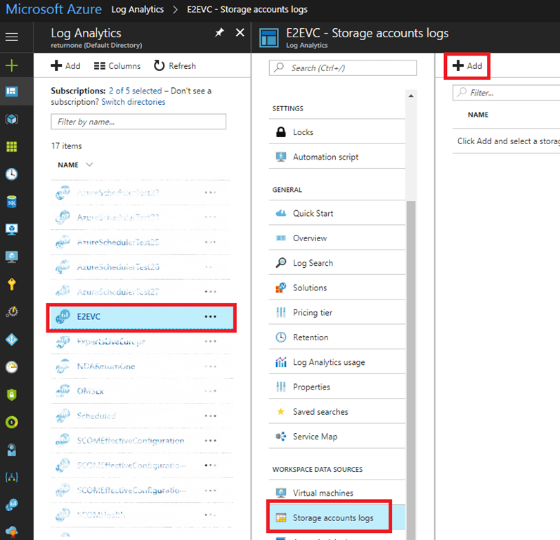 …the documentation link does not provide much help in terms of connecting or removing these accounts. Therefore go to the new Azure portal, select your workspace and select “Storage account logs” and click Add…
